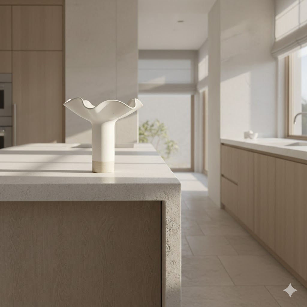 Her fluid, organic forms feature soft curves, undulating waves, and delicate folds, echoing the natural rhythms of her coastal environment — from rock pools and sand dunes to winding bays.